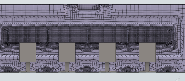 Po zdefiniowaniu tego wszystkiego, wygenerowano siatkę, składającą się przeważnie z elementów heksagonalnych. Maksymalny rozmiar elementu jest równy 90 mm, a minimalny jest równy 15mm. Dodatkowo dodano warstwę przyścienną składającą się z 5 elementów, a grubość pierwszego elementu jest równa 2 mm. Dodatkowo zagęszczono siatkę w okolicach wylotu, gdzie zdefiniowano rozmiar elementów równy 30 mm. Dla takiej definicji całkowita liczba elementów była równa 6 791 000. Wygląd siatki został umieszczony poniżej.