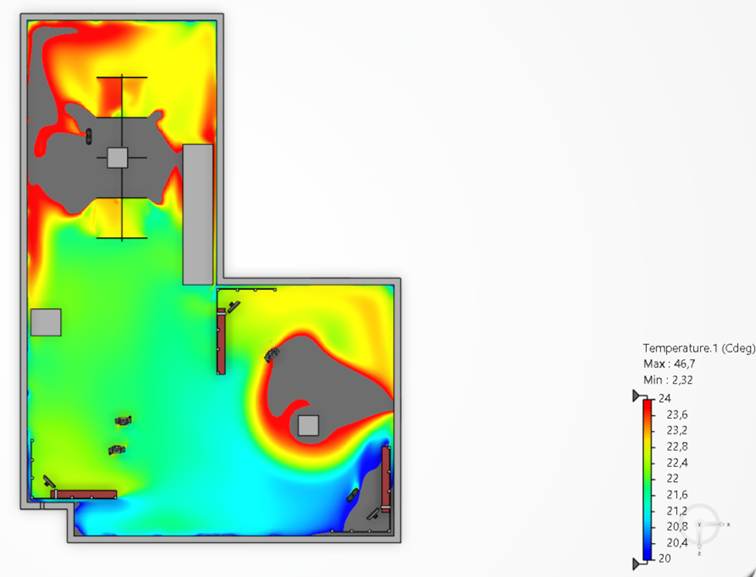 Obszary oznaczone na zielono są optymalne pod względem komfortu termicznego, natomiast obszary oznaczone na szaro są identyfikowane jako termicznie niekomfortowe. Chociaż większość powierzchni biurowej ma komfortowy zakres temperatur od 20℃ do 24℃, różnica temperatur 4° sugeruje , że temperatura nie jest jednolita. Zamknięta przestrzeń o jednolitej temperaturze zapewnia lepszy komfort termiczny dla osób w niej przebywających.