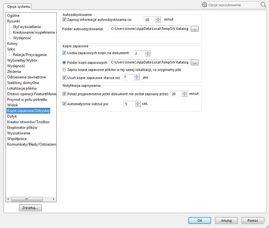 Usuń kopie zapasowe starsze niż…dni. Wszelkie nieaktualne kopie zapasowe są usunięte przy uruchomieniu SOLIDWORKS.