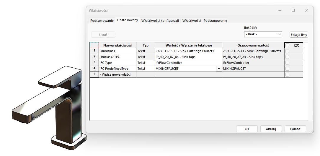 - Dostosowane właściwości – określa właściwości dostosowane eksportowanego pliku .IFC