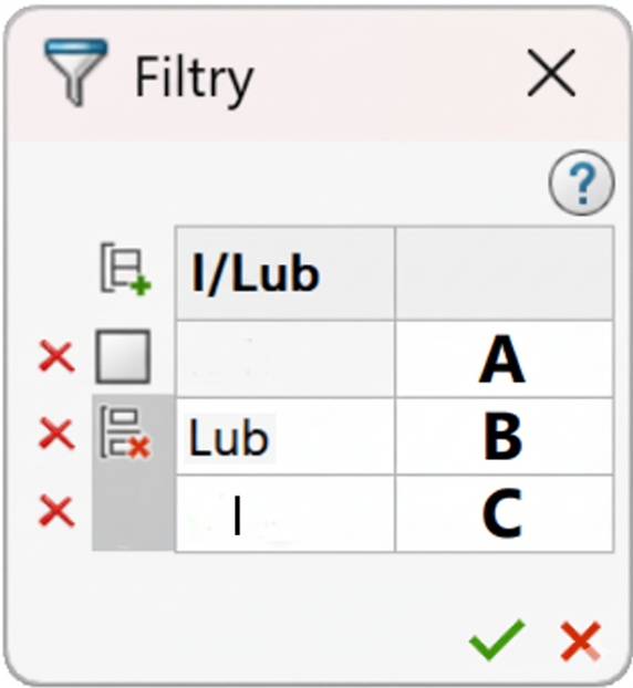 Można grupować kilka wierszy, tworząc nawiasy. Na przykład, jeśli chcesz napisać: A lub (B i C), możesz użyć następującego filtra: