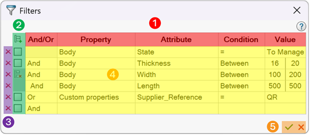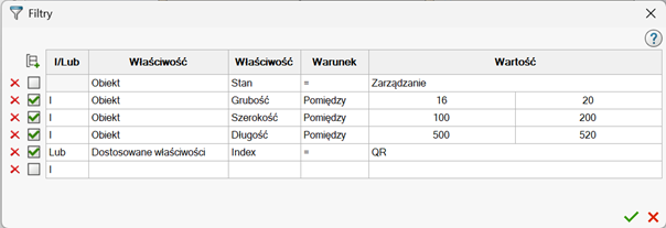 Poprzez kliknięcie ikony zatwierdzenia zapiszemy nowoustawione filtry, natomiast klikając czerwony X odrzucimy zmiany i wrócimy tym samym do poprzednio zapisanych filtrów.