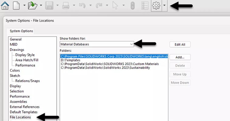 Aby to zrobić, należy określić lokalizacje plików bibliotek materiałów SOLIDWORKS. W SOLIDWORKS należy przejść do Opcje systemowe > Lokalizacje plików > Bazy danych materiałów . Są to typy plików „.sldmat”.