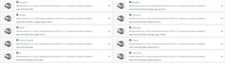 Baza danych dla mechaniki płynu zawiera takie materiały jak powietrze, woda, czy też azot i tlen.