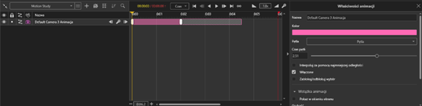 Animacje kamer możemy edytować przy pomocy parametrów przypisanych do animacji lub klatki kluczowej.
