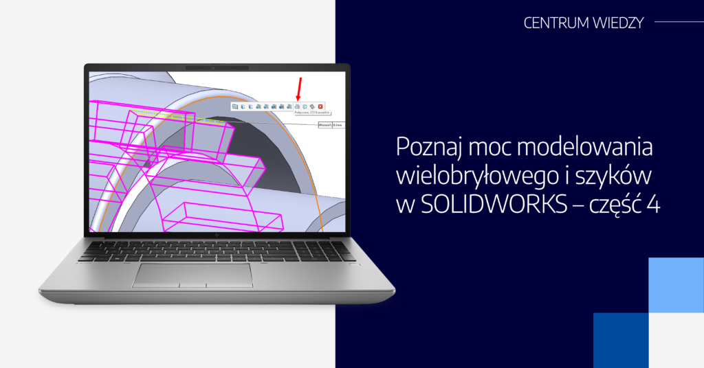 Na końcu tego wycięcia wstawiamy szkic z okręgiem o średnicy Ø8 mm. Wykonujemy operację Wyciągnięcie wycięcia przez wszystko i zaznaczamy bryły w których chcemy usunąć materiał.