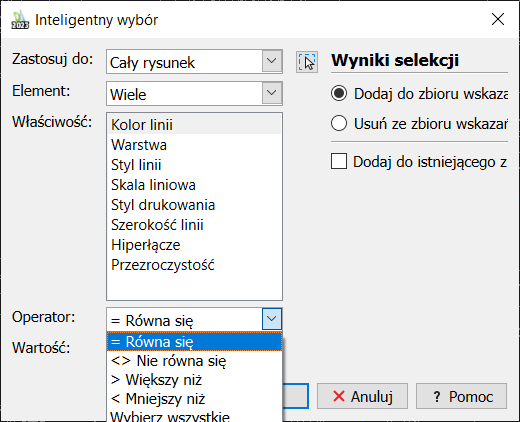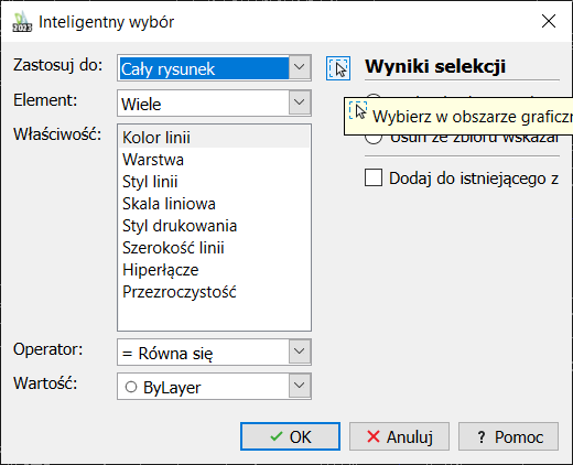 Po wywołaniu operacji Inteligentnego zaznacza wyskoczy okienko z dostępnymi opcjami. Przyjrzyjmy się temu co możemy zdziałać przy pomocy tej funkcji. Idąc od góry mamy opcję „Zastosuj do” do której jest przypisane menu rozwijalne. Domyślnie będzie tam do wyboru tylko opcja „Cały rysunek”, natomiast na prawo od niej mamy przycisk przy pomocy którego możemy ograniczyć wybór do zaznaczonego oknem obszaru rysunku.