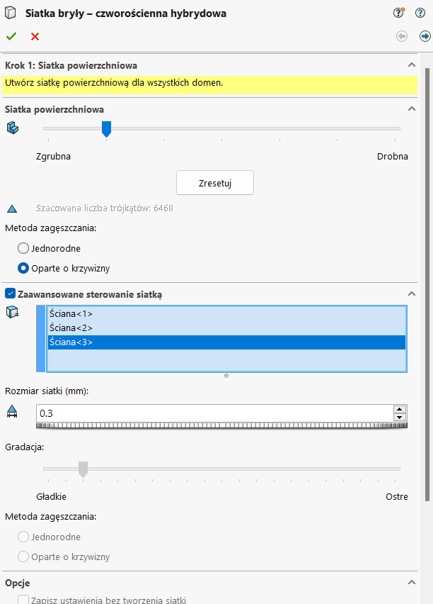 Rys. 14 Wybór typu siatkiTam należy określić zagęszczenie siatki. W tym celu suwak został przesunięty z pozycji środkowej w kierunku siatki zgrubnej. Ponadto zdecydowano się na zagęszczanie siatki w pobliżu zagięć geometrii (Patrz Rysunek 15). Opcją odpowiedzialną za to jest „metoda zagęszczania: oparta o krzywizny”. Po zaakceptowaniu takich opcji, siatka wygląda następująco (Patrz Rysunek 16):