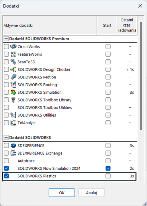 Rys. 2 Włączenie dodatku SOLIDWORKS PlasticsPo wykonaniu powyższych kroków, pojawia się nowa zakładka, która umożliwia przeprowadzenie symulacji (Patrz Rysunek 3).