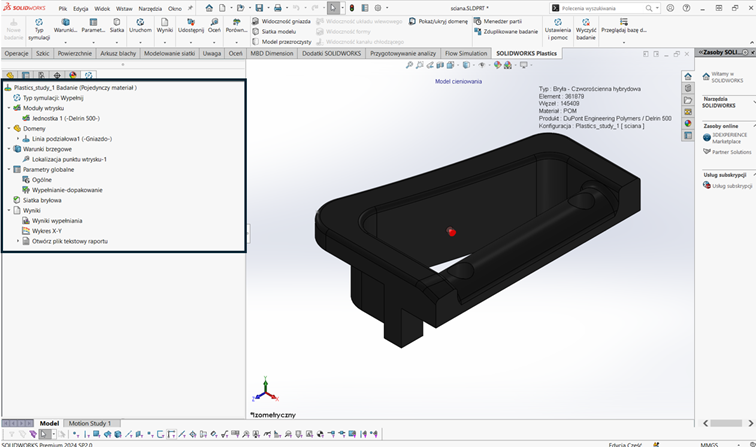 Narzędziem umożliwiającym dokonanie optymalizacji wtrysku tworzywa sztucznego jest SOLIDWORKS Plastics. Pozwala on na zasymulowanie etapów wypełnienia, dopakowania, chłodzenia oraz umożliwia przeprowadzenie analizy wypaczenia. Pomimo tak szerokich możliwości, w tym artykule skupię się jedynie na pierwszym, ale też i najważniejszym etapie procesu wtrysku, a mianowicie na etapie wypełnienia. Zostanie zaprezentowane, krok po kroku, jak przeprowadzić symulację wtrysku tworzywa sztucznego w SOLIDWORKS Plastics. Następnie zostaną pokazane otrzymane wyniki symulacji, które zapewniają tym samym płynność i efektywność procesu produkcyjnego. Tyle słowem wstępu, zapraszam do dalszej lektury.