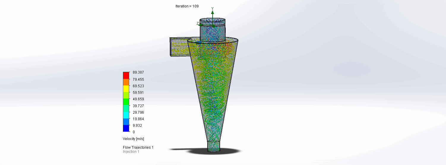 Celem poniższej symulacji jest zamodelowanie cyklonu, do którego doprowadzane jest zanieczyszczone powietrze z prędkością 60 m/s. Cząstki żelaza są traktowane elementy doprowadzane razem z powietrzem.