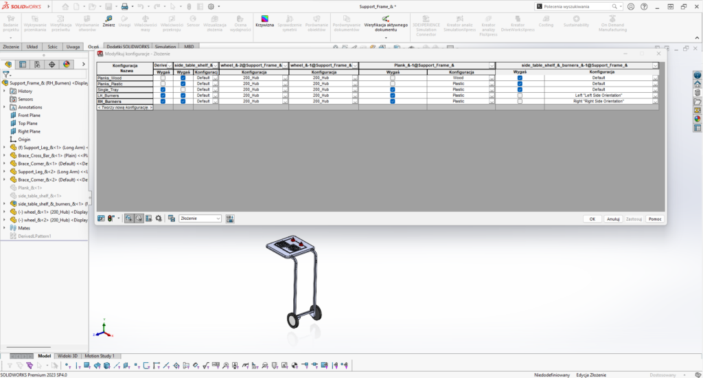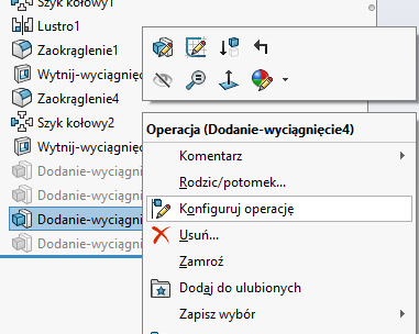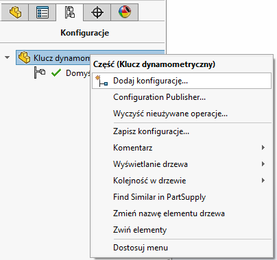 Konfiguracji części używa się gdy mamy elementy bardzo podobne do siebie i nie chcemy ich zapisywać w oddzielnych plikach, wykorzystać je w bibliotece czy zrobić uproszczoną wersję części, żeby użyć jej w dużym złożeniu.