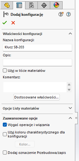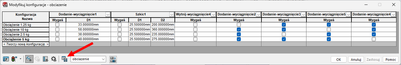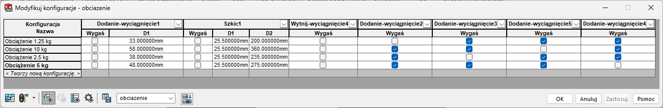 Jak już wspomniałem wcześniej, jeżeli robimy konfigurację przy pomocy tabeli, będziemy widzieli ustawienia dla wszystkich konfiguracji jednocześnie. Dodatkowo możemy zbudować sobie kompleksową tabelę zawierającą wszystkie wymiary szkiców i operacji, które potrzebujemy zmienić oraz operacje, które mają być wygaszane.