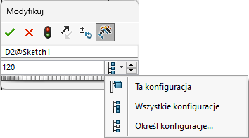 Jeżeli mamy utworzone kilka konfiguracji, to zyskujemy opcję wyboru zmian we wszystkich konfiguracjach, wybranych lub tylko bieżącej. Na przykład na obrazku poniżej widać zmianę wymiary w szkicu, przed zatwierdzeniem wartości wymiaru możemy określić czy zmiana ta będzie globalna czy ograniczona do konkretnych wersji naszego modelu.