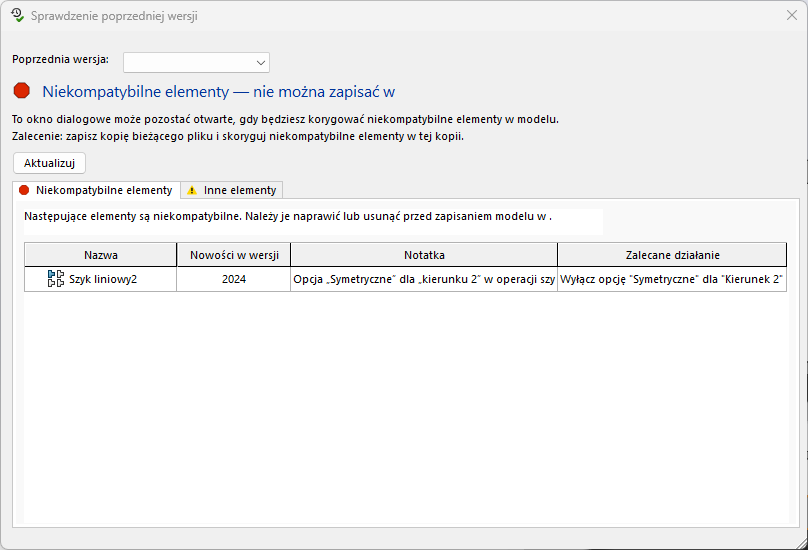 - Zapis do nowszej (aktualnej) wersji powoduje brak możliwości otwarcia projektu w starszych wersjach.