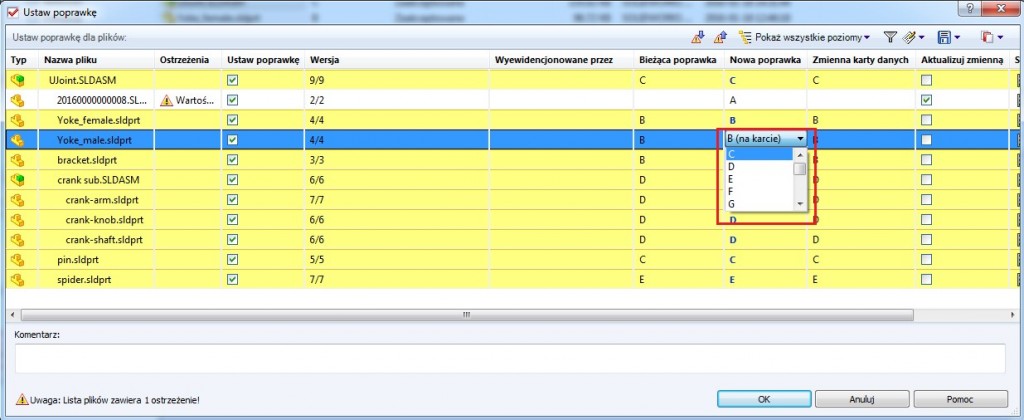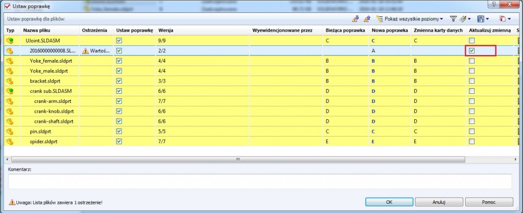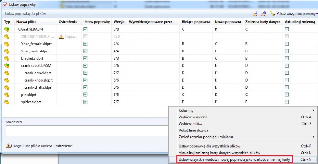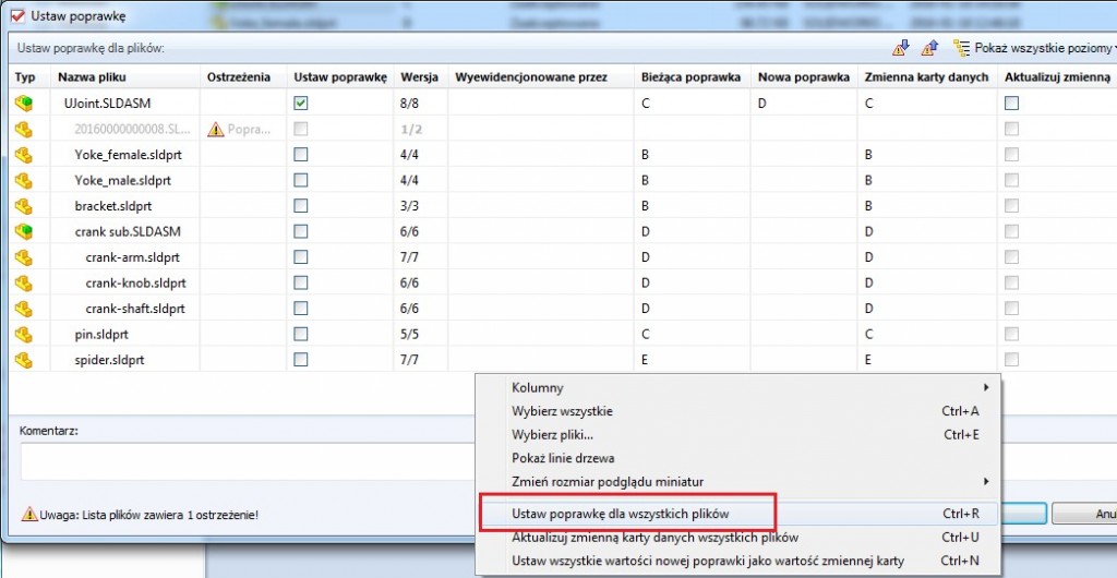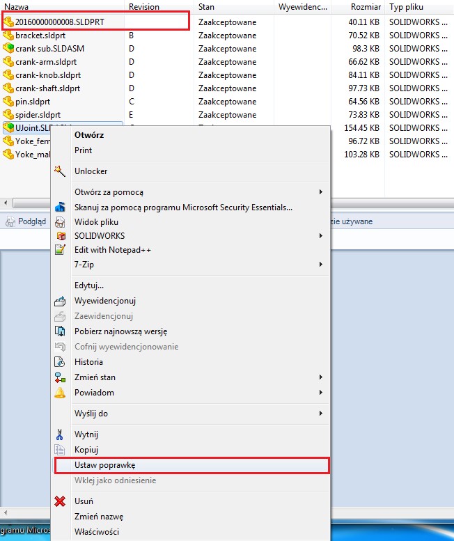 Załóżmy, że mamy przypadek złożenia, którego pliki mają różne rewizje, a jeden z nich nie ma jej w ogóle. Chcemy nadać mu rewizję „A” bez przejścia przez wszystkie stany „Toku prac”. Prawym przyciskiem myszy klikamy na głównym złożeniu (tu plik UJoint.SLDASM) wybieramy opcję „Ustaw poprawkę”.