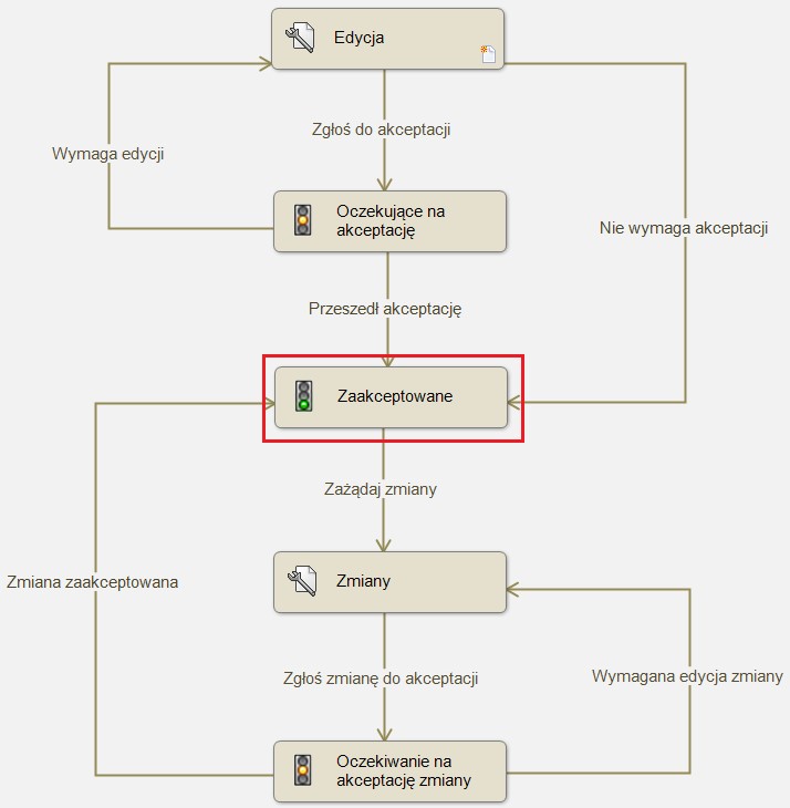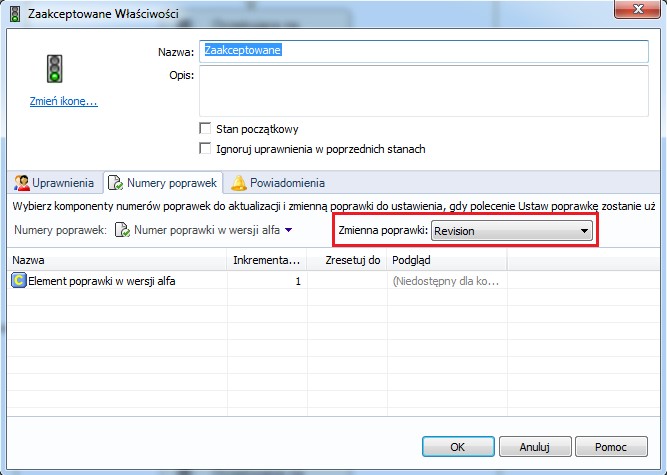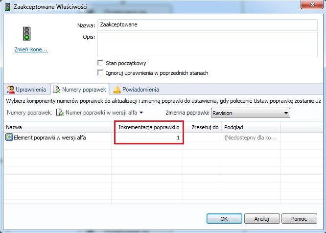 Wybrać stan, na którym jest inkrementowana poprawka, najczęściej jest to stan oznaczający zatwierdzoną dokumentację np. „Zatwierdzone” lub „Zaakceptowane”. Otwieramy jego właściwości.
