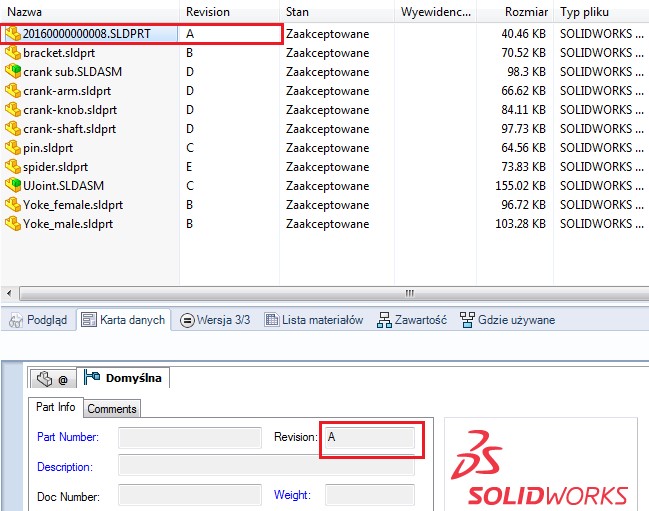 W ten sposób plik otrzymał pierwszą rewizję „A” zmapowaną z polem karty pliku – dzięki odpowiednim ustawieniom karty oraz zmiennej rewizji.