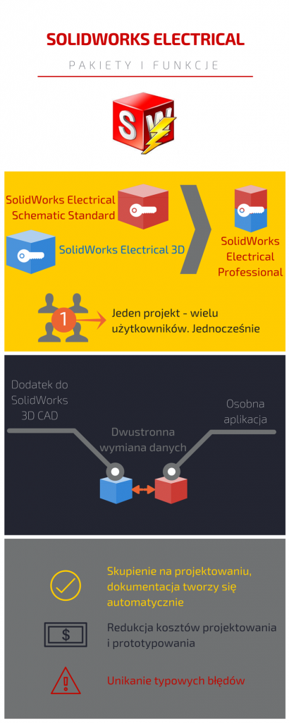 Od niedawna producent SOLIDWORKS wychodzi naprzeciw tym problemom, proponując swoim klientom pakiet programów SOLIDWORKS Electrical. Proces projektowania instalacji elektrycznych różni się od procesu projektowania współczesnych urządzeń mechanicznych. Najpierw powstaje schemat (rysunek) – następnie osoba odpowiedzialna za projekt od strony mechanicznej układa elementy tak, aby zmieściły się w zazwyczaj ograniczonej objętości (model 3D). Ta kolejność jest odzwierciedlona w pakietach  SOLIDWORKS Electrical. Zatem: