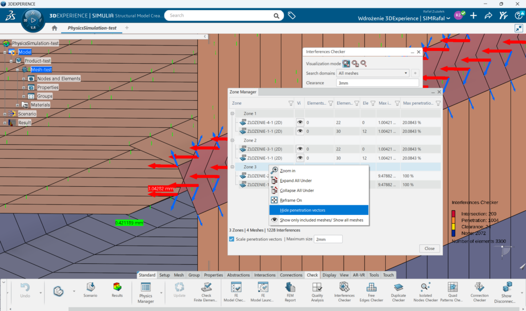 W analizach kontaktowych kluczowe jest dokładne określenie, gdzie występują interferencje między powierzchniami oraz jak duża jest ich penetracja. W 3DEXPERIENCE 2026 wprowadzono czytelną wizualizację tych penetracji w postaci wektorów.