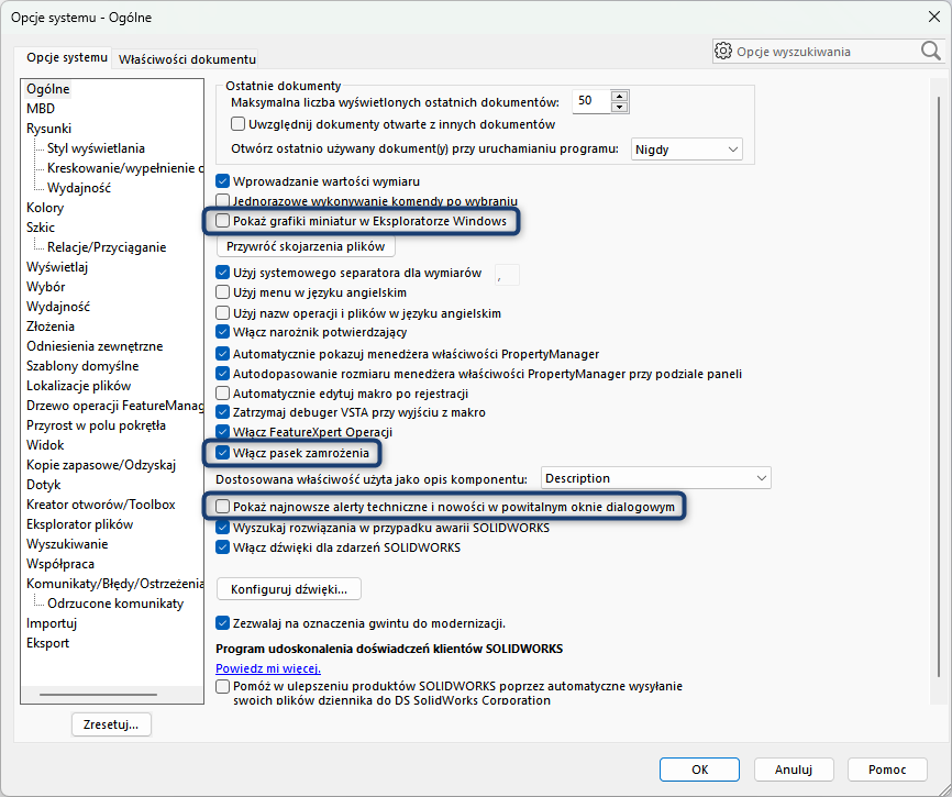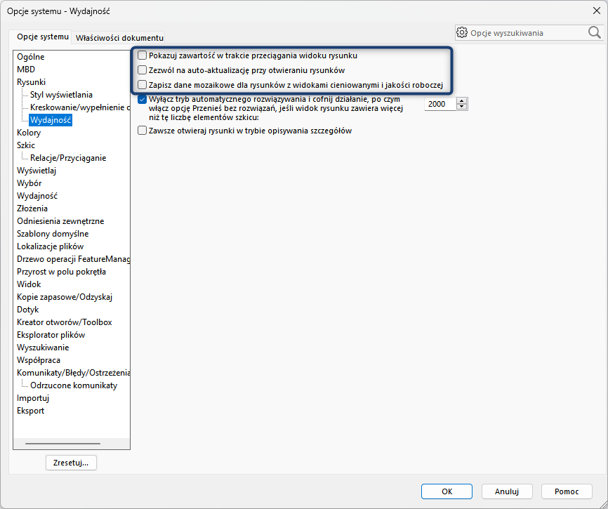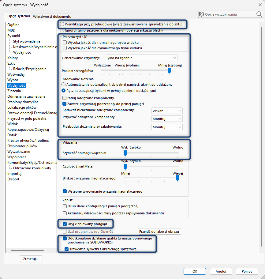 Poniżej przedstawiam Państwu wszystkie rekomendowane ustawienia pod kątem optymalizacji wydajności w oprogramowaniu SolidWorks 2024. Należy pamiętać o tym, że ograniczają one w jakimś stopniu funkcjonalnosć programu i przede wszystkim sugerowałbym najpierw zapoznać się częścią pierwszą tego artykułu, który opisuje dobre praktyki dotyczące modelowania, zarządzania projektem oraz innymi ustawieniami systemowymi.