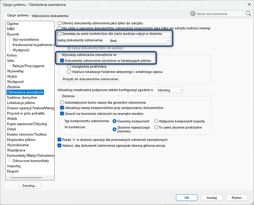 8.2. Zezwalaj na wiele kontekstów dla części podczas edycji w złożeniu – wyczyść – bez tej opcji każda indywidualna operacja lub szkic w danym złożeniu może mieć tylko jedno odniesienie zewnętrzne