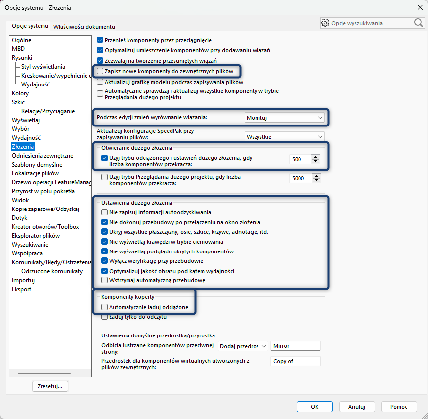 7.4. Ustawienia dużego złożenia – zaznacz wszystko oprócz „Nie zapisuj informacji autoodzyskiwania” oraz „Wstrzymaj automatyczną przebudowę”
