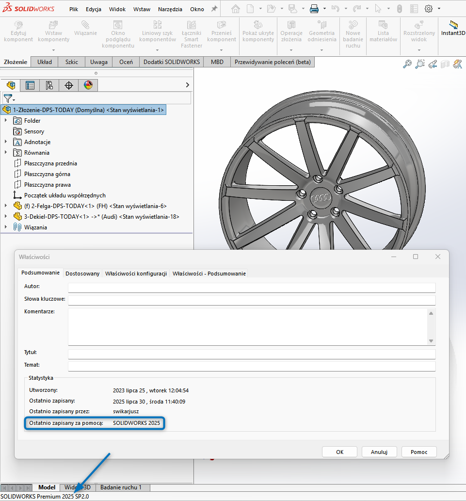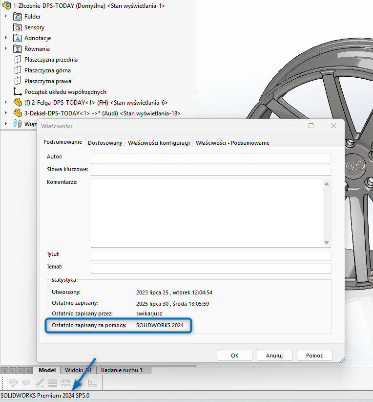 Na ilustracjach powyżej widać plik, który powstał w SOLIDWORKS 2025, a następnie został zapisany jako plik z 2024. Na ilustracji poniżej, informacja „Ostatnio zapisany za pomocą: SOLIDWORKS 2024” potwierdza skuteczność zapisu wstecznego: