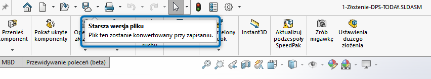 To oczywiście nie stanowi problemu. Jeśli otworzymy plik zapisany w starszej wersji (np. 2024) w SOLIDWORKS 2025, zobaczymy standardowy komunikat:
