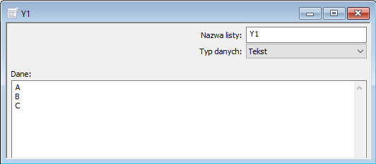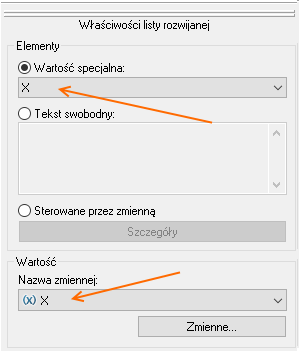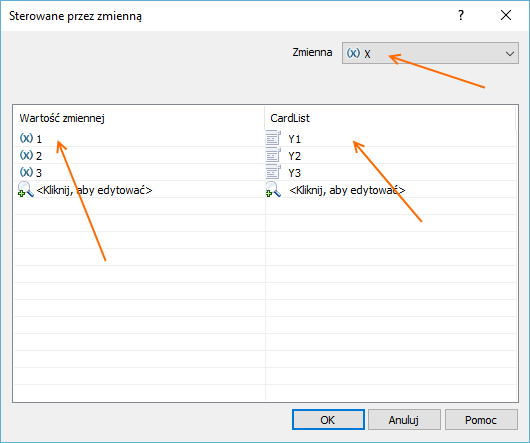 Listę Y konfigurujemy w taki sposób, że powiązujemy jej wartość ze zmienną Y natomiast jako element wybieramy sterowne przez zmienną.