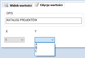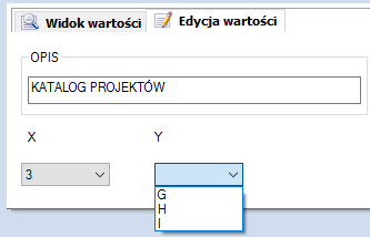 Wybieramy zmienną X bo to jej wartość będzie sterowała wartością zmiennej Y. I Po lewej wpisujemy pożądane wartości zmiennej X a po prawej wybieramy jaka lista ma się podłączyć przy danej wartości.